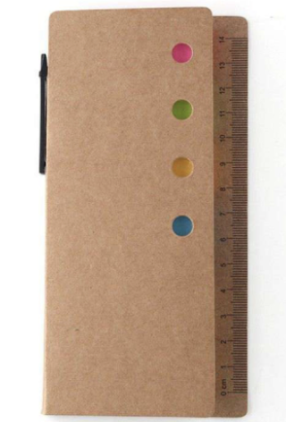 Kit Post-its y Lapicera. Incluye 4 blocs largos, 1 cuadrado, lapicera y regla en la tapa para una versatilidad única.